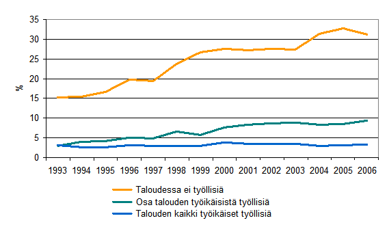 Vain neljä sadasta työssä käyvästä jää pienituloisuusrajan alapuolelle. Luku on pysynyt samalla tasolla viimeiset 14 vuotta. Paras suoja pienituloisuutta vastaan on saavutettu, kun kotitalouden kaikki työikäiset ovat olleet suurimman osan vuodesta työllistyneinä. Tällaisten talouksien pienituloisuusriski on pysynyt pienenä koko tarkastelujakson. Kun yksikään kotitalouden jäsen ei toiminut työmarkkinoilla, suhteellisen pienituloisuuden riski oli kymmenkertainen vuonna 2006. Pienituloisuusriski on kolminkertaistunut vuodesta 1993 niissä kotitalouksissa, joissa vain osa työikäisistä toimi työmarkkinoilla. Yleinen pienituloisuusaste oli 12,5 prosenttia vuonna 2006.