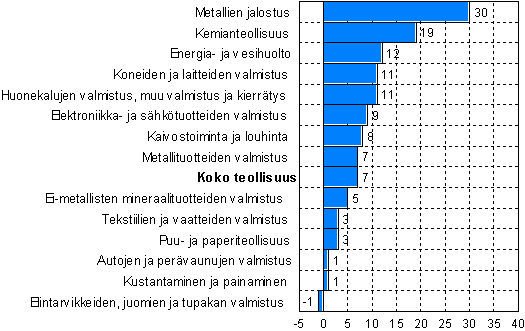 Liikevaihto kasvoi touko-heinäkuussa kaikilla muilla toimialoilla paitsi elintarvikkeiden, juomien ja tupakan valmistuksessa. Suurimmista toimialoista kasvua kertyi eniten kemianteollisuudessa ja elektroniikka- ja sähkötuotteiden valmistuksessa. Eniten liikevaihto kasvoi kuitenkin edelleen metallien jalostuksessa, 30 prosenttia. Puu- ja paperiteollisuuden liikevaihto kasvoi 3 prosenttia vuotta aiemmasta.