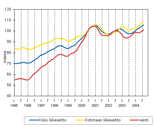Koko teollisuuden liikevaihdon, kotimaan liikevaihdon ja viennin trendisarjat