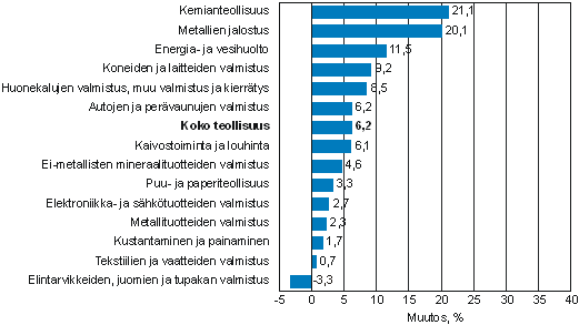 Liikevaihto kasvoi edelleen eniten kemianteollisuudessa ja metallien jalostuksessa. Sen sijaan elektroniikka- ja sähkötuotteiden valmistuksessa liikevaihdon kasvunopeus hieman hidastui alkukesän lukuihin verrattuna. Elintarviketeollisuudessa liikevaihdon lasku jatkui. Myös tekstiiliteollisuudessa liikevaihdon kasvu on hidastunut alkuvuodesta.
