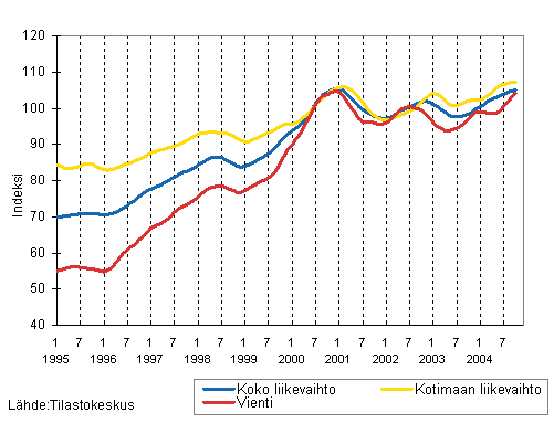 Koko teollisuuden liikevaihdon, kotimaan liikevaihdon ja viennin trendisarjat