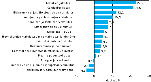 Liikevaihdon kasvu oli edelleen voimakkainta kemianteollisuudessa ja metallien jalostuksessa. Elektroniikka- ja sähkötuotteiden valmistuksessa liikevaihdon kasvu kiihtyi. Myös kaikki muut metalliteollisuuden toimialat kasvoivat. Elintarviketeollisuudessa ja tekstiiliteollisuudessa sen sijaan liikevaihdon lasku jatkui.
