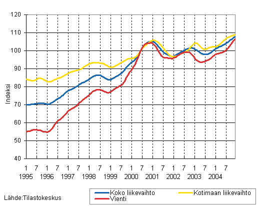 Koko teollisuuden liikevaihdon, kotimaan liikevaihdon ja viennin trendisarjat 1/1995 - 12/2004, 2000=100