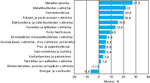 Liikevaihto kasvoi eniten metallien jalostuksessa ja metallituotteiden valmistuksessa. Kasvu oli voimakasta myös muilla metalliteollisuuden alatoimialoilla ja kemianteollisuudessa. Myös puu- ja paperiteollisuudessa liikevaihdon kasvu kiihtyi. Elintarviketeollisuudessa ja energia- ja vesihuollon toimialalla liikevaihto laski joulu-helmikuussa vuotta aiempaan verrattuna.