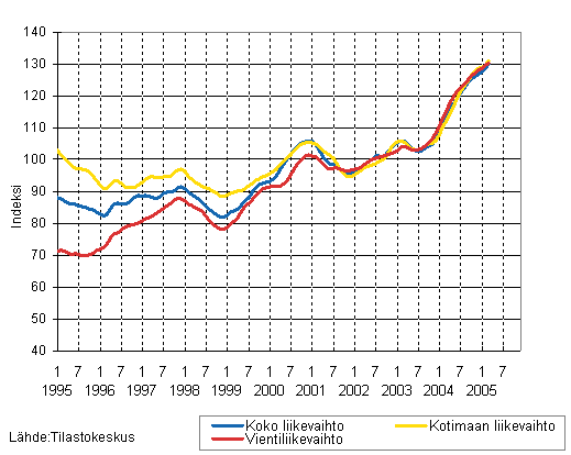 Kemianteollisuuden liikevaihdon, kotimaan liikevaihdon ja vientiliikevaihdon trendisarjat 1/1995 - 3/2005, 2000=100