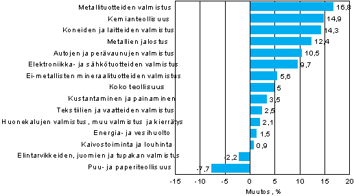 Maalis-toukokuussa puu- ja paperiteollisuuden liikevaihto pieneni noin 8 prosenttia vuotta aiemmasta. Kehitykseen vaikutti toukokuun osalta paperiteollisuuden työkiista; toukokuussa liikevaihto väheni 18 prosenttia vuodentakaisesta. Kemianteollisuuden liikevaihto oli maalis-toukokuussa 15 prosenttia edellisvuoden vastaavaa aikaa suurempi. Kasvuvauhti hidastui edellisiin kolmen kuukauden jaksoihin verrattuna. Koneiden ja laitteiden valmistuksen kasvuvauhti sen sijaan hieman kiihtyi; maalis-toukokuussa liikevaihto kasvoi 14 prosenttia. Elektroniikka- ja sähkötuotteiden valmistuksen liikevaihdon kasvu oli maalis-toukokuussa 10 prosenttia. Kasvu oli hitaampaa kuin edellisellä kolmen kuukauden ajanjaksolla.