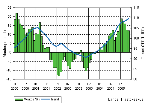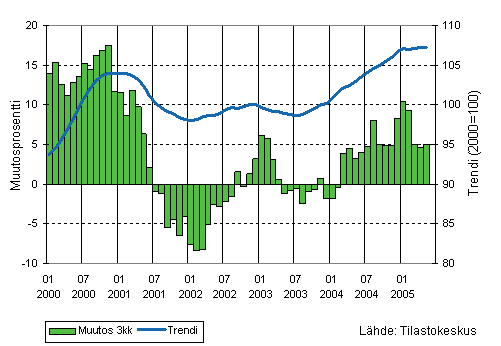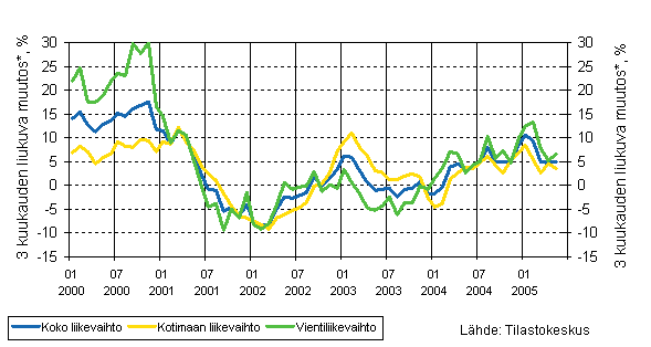 Teollisuusyritysten liikevaihto oli Tilastokeskuksen mukaan vuoden 2005 maalis-toukokuussa 5 prosenttia suurempi kuin vastaavalla ajanjaksolla vuotta aiemmin. Vientiliikevaihto kasvoi 7 prosenttia ja kotimaan myynti 4 prosenttia vuotta aiemmasta.