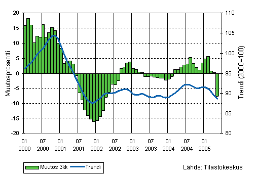 Puu- ja paperiteollisuuden liikevaihdon kolmen kuukauden liukuva vuosimuutos ja trendi 1/2000-5/2005, 2000=100