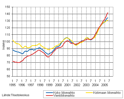Kemianteollisuuden liikevaihdon, kotimaan liikevaihdon ja vientiliikevaihdon trendisarjat 1/1995 - 5/2005, 2000=100
