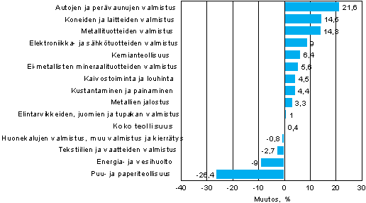 Koko teollisuuden liikevaihdon kasvua hidastivat kesä-elokuussa etenkin puu- ja paperiteollisuus sekä energia- ja vesihuolto. Puu- ja paperiteollisuuden liikevaihto pieneni kesä-elokuussa noin 26 prosenttia vuotta aiemmasta; elokuussa liikevaihto pysyi kuitenkin suurin piirtein ennallaan vuodentakaiseen verrattuna. Energia- ja vesihuollon liikevaihto aleni noin 9 prosenttia vuotta aiemmasta. Kemianteollisuuden liikevaihto oli kesä-elokuussa 6 prosenttia edellisvuoden vastaavaa aikaa suurempi. Kasvuvauhti hidastui edellisiin kolmen kuukauden jaksoihin verrattuna. Koneiden ja laitteiden valmistuksessa liikevaihto kasvoi 14 prosenttia. Elektroniikka- ja sähkötuotteiden valmistuksen liikevaihdon kasvu oli kesä-elokuussa 9 prosenttia. Kasvu oli hieman hitaampaa kuin edellisellä kolmen kuukauden ajanjaksolla.