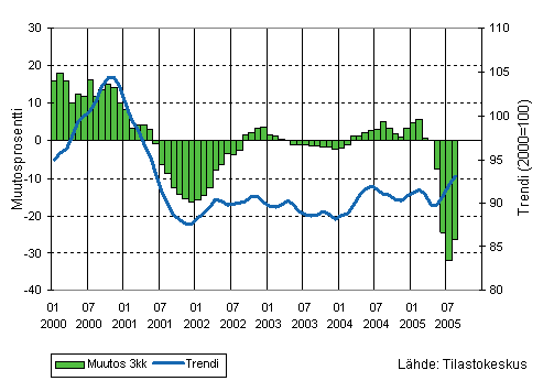 Puu- ja paperiteollisuuden liikevaihdon kolmen kuukauden liukuva vuosimuutos ja trendi 1/2000-8/2005, 2000=100