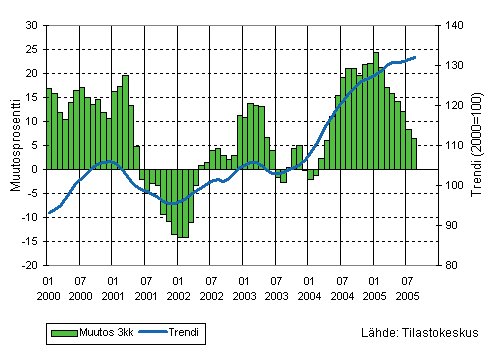 Teollisuuden liikevaihdon kolmen kuukauden liukuva vuosimuutos ja trendi 1/2000-8/2005, 2000=100