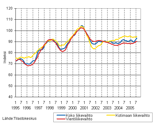 Puu- ja paperiteollisuuden liikevaihdon, kotimaan liikevaihdon ja vientiliikevaihdon trendisarjat 1/1995 - 8/2005, 2000=100