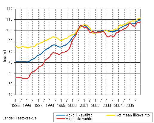 Koko teollisuuden liikevaihdon, kotimaan liikevaihdon ja vientiliikevaihdon trendisarjat 1/1995 - 12/2005, 2000=100