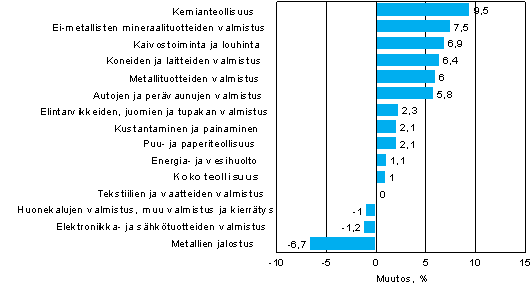 Liikevaihto kasvoi eniten kemianteollisuudessa ja ei-metallisten mineraalituotteiden valmistuksessa. Elektroniikka- ja sähkötuotteiden valmistuksessa liikevaihto kääntyi laskuun. Liikevaihto pieneni myös metallien jalostuksessa sekä huonekalujen valmistuksen, muun valmistuksen ja kierrätyksen toimialalla.