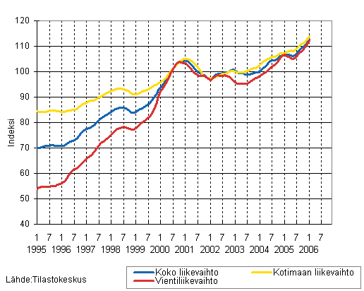 Koko teollisuuden liikevaihdon, kotimaan liikevaihdon ja vientiliikevaihdon trendisarjat 1/1995 - 1/2006, 2000=100
