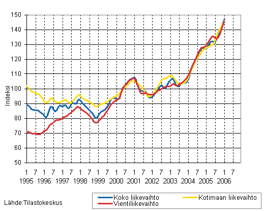 Kemianteollisuuden liikevaihdon, kotimaan liikevaihdon ja vientiliikevaihdon trendisarjat 1/1995 - 1/2006, 2000=100