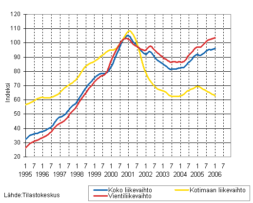 Sähkö- ja elektroniikkateollisuuden liikevaihdon, kotimaan liikevaihdon ja vientiliikevaihdon trendisarjat 1/1995 - 1/2006, 2000=100