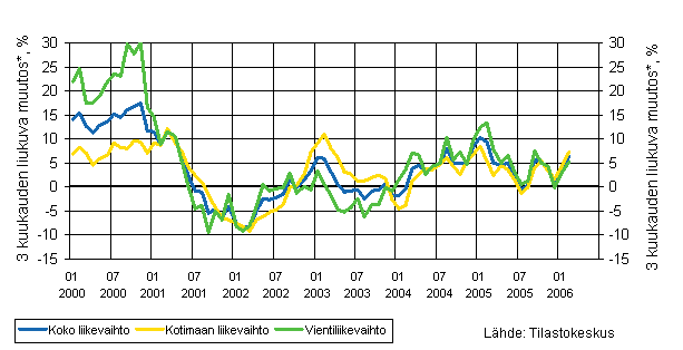 Koko liikevaihdon, vientiliikevaihdon ja kotimaan myynnin kehitys 1/2000 - 2/2006, kolmen kuukauden liukuva vuosimuutos, %