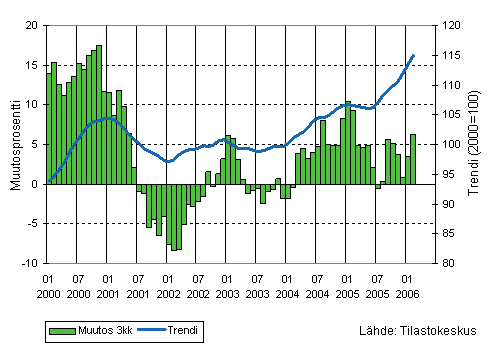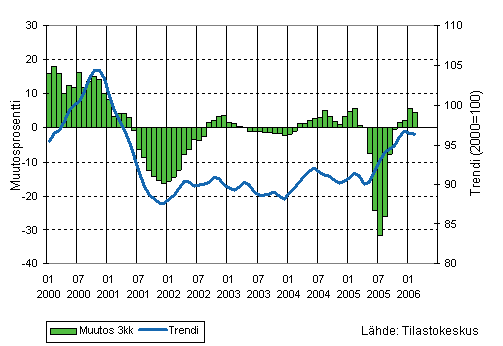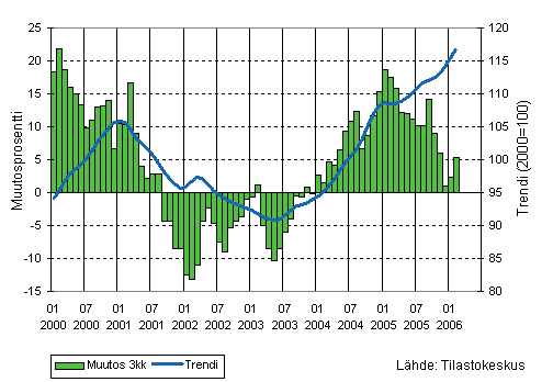 Teollisuuden liikevaihdon kolmen kuukauden liukuva vuosimuutos ja trendi 1/2000-2/2006, 2000=100