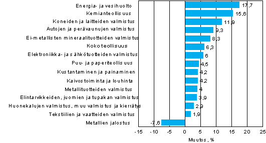 Liikevaihto kasvoi joulu-helmikuussa eniten energia- ja vesihuollossa, 18 prosenttia, ja kemianteollisuudessa, 16 prosenttia. Kasvun takana oli erityisesti sähkön ja öljytuotteiden kallistuminen. Näiden toimialojen lisäksi liikevaihdon kasvu kiihtyi edellisen kolmen kuukauden ajanjakson kasvuvauhtiin verrattuna erityisesti puu- ja paperiteollisuudessa sekä koneiden ja laitteiden valmistuksessa. Joulu-helmikuussa liikevaihto väheni vuotta aiemmasta ainoastaan metallien jalostuksessa.