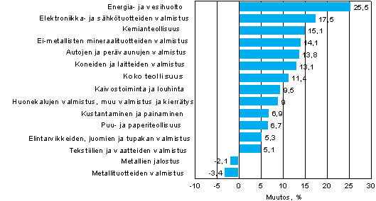 Liikevaihto kasvoi tammi-maaliskuussa eniten energia- ja vesihuollossa, 25 prosenttia, ja elektroniikka- ja sähkötuotteiden valmistuksessa, 17 prosenttia. Myös kemianteollisuudessa liikevaihto kasvoi ripeästi. Energia- ja vesihuollossa liikevaihdon kasvun takana on erityisesti sähkön hinnan nousu ja kemianteollisuudessa öljytuotteiden kallistuminen. Ensimmäisellä vuosineljänneksellä liikevaihto väheni vuotta aiemmasta metallituotteiden valmistuksessa ja metallien jalostuksessa.