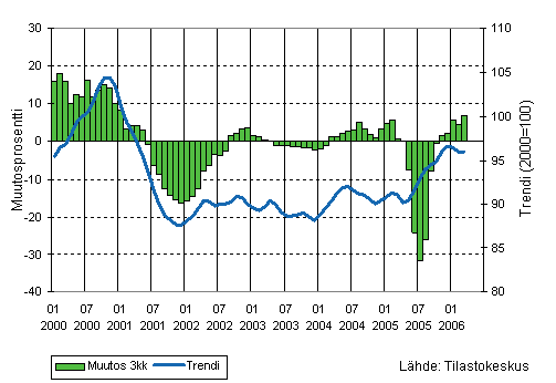 Teollisuuden liikevaihdon kolmen kuukauden liukuva vuosimuutos ja trendi 1/2000-3/2006, 2000=100