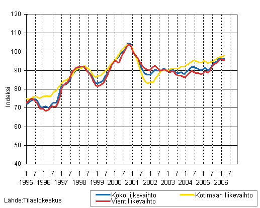 Puu- ja paperiteollisuuden liikevaihdon, kotimaan liikevaihdon ja vientiliikevaihdon trendisarjat 1/1995 - 3/2006, 2000=100