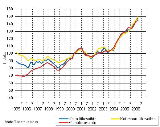 Kemianteollisuuden liikevaihdon, kotimaan liikevaihdon ja vientiliikevaihdon trendisarjat 1/1995 - 3/2006, 2000=100