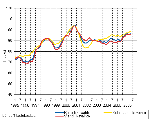 Puu- ja paperiteollisuuden liikevaihdon, kotimaan liikevaihdon ja vientiliikevaihdon trendisarjat 1/1995 - 4/2006, 2000=100