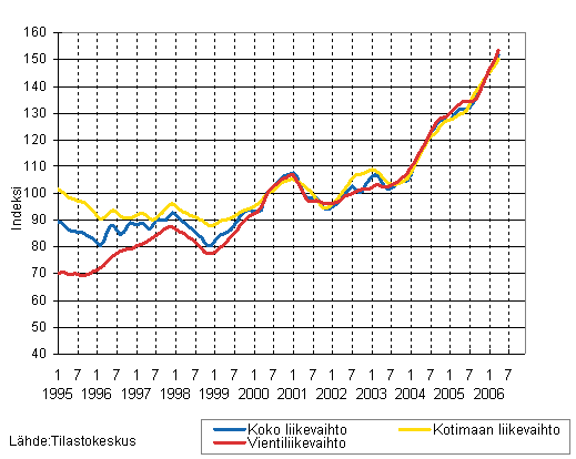 Kemianteollisuuden liikevaihdon, kotimaan liikevaihdon ja vientiliikevaihdon trendisarjat 1/1995 - 4/2006, 2000=100