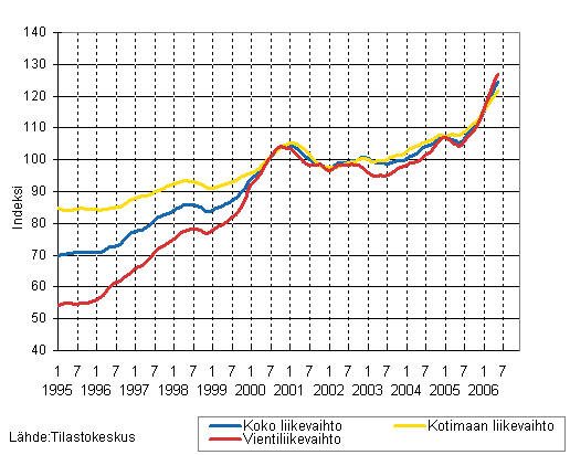Koko teollisuuden liikevaihdon, kotimaan liikevaihdon ja vientiliikevaihdon trendisarjat 1/1995 - 5/2006, 2000=100