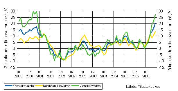 Koko liikevaihdon, vientiliikevaihdon ja kotimaan myynnin kehitys 1/2000 - 6/2006, kolmen kuukauden liukuva vuosimuutos, %