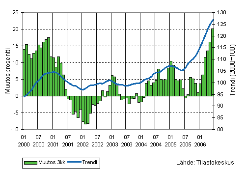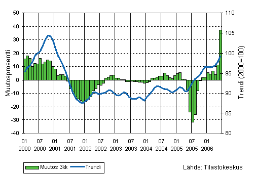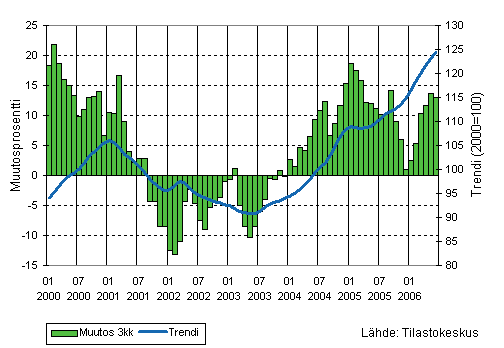 Teollisuuden liikevaihdon kolmen kuukauden liukuva vuosimuutos ja trendi 1/2000-6/2006, 2000=100