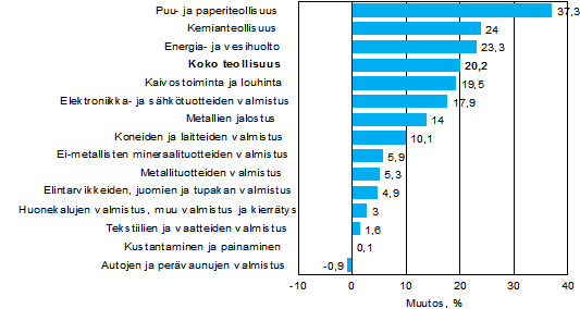 Liikevaihto kasvoi huhti-kesäkuussa eniten puu- ja paperiteollisuudessa, 37 prosenttia. Toimialan kasvuun vaikutti viime vuoden touko-kesäkuun alhainen vertailutaso tuotantoseisokkien vuoksi. Myös kemianteollisuudessa, energia- ja vesihuollossa sekä kaivostoiminnan ja louhinnan toimialalla liikevaihdon kasvu oli nopeaa. Näillä toimialoilla liikevaihdon kasvua selittää osittain tuottajahintojen nousu. Liikevaihto kasvoi reippaasti myös elektroniikka- ja sähkötuotteiden valmistuksessa. Lisäksi koko teollisuuden liikevaihtoa kasvattivat ajanjaksolle osuneet risteilyalusten myynnit. Liikevaihto väheni vuotta aiemmasta ainoastaan autojen ja perävaunujen valmistuksessa.