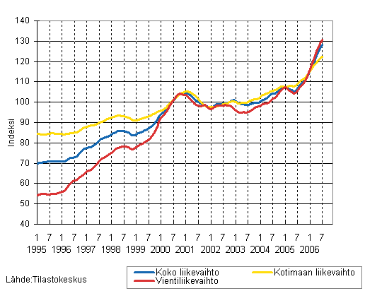 Koko teollisuuden liikevaihdon, kotimaan liikevaihdon ja vientiliikevaihdon trendisarjat 1/1995 - 7/2006, 2000=100