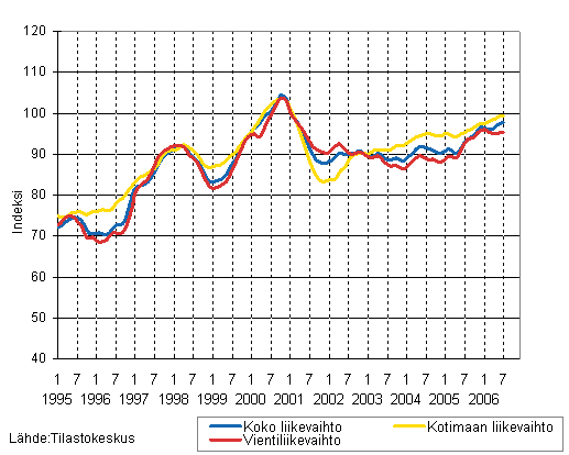 Puu- ja paperiteollisuuden liikevaihdon, kotimaan liikevaihdon ja vientiliikevaihdon trendisarjat 1/1995 - 7/2006, 2000=100