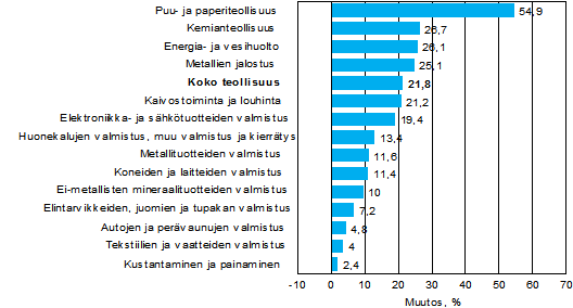 Liikevaihto kasvoi touko-heinäkuussa eniten puu- ja paperiteollisuudessa, 55 prosenttia. Toimialan kasvuun vaikutti viime vuoden vastaavan ajanjakson alhainen vertailutaso tuotantoseisokkien vuoksi. Myös kemianteollisuudessa, energia- ja vesihuollossa, metallien jalostuksessa sekä kaivostoiminnan ja louhinnan toimialalla liikevaihdon kasvu oli nopeaa. Näillä toimialoilla liikevaihdon kasvua selittää osittain tuottajahintojen nousu eli muun muassa öljytuotteiden, kuparin ja sähkön kallistuminen. Liikevaihto kasvoi reippaasti myös elektroniikka- ja sähkötuotteiden valmistuksessa.