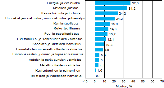Liikevaihto kasvoi heinä-syyskuussa eniten energia- ja vesihuollossa, 37,6 prosenttia. Toimialan liikevaihdon kasvua selittää osaltaan sähkön tuottajahintojen nousu. Myös metallien jalostuksessa ja kaivostoiminnassa ja louhinnassa liikevaihdon kasvu oli nopeaa. Liikevaihto kasvoi heinä-syyskuussa kaikilla teollisuuden alatoimialoilla. Hitainta liikevaihdon kasvu oli tekstiilien ja vaatteiden valmistuksessa.