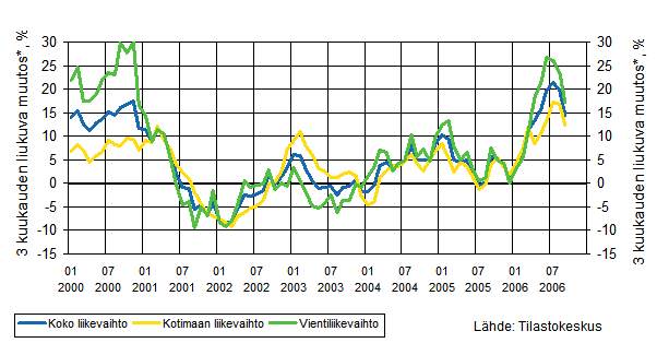 Koko liikevaihdon, vientiliikevaihdon ja kotimaan myynnin kehitys 1/2000 - 9/2006, kolmen kuukauden liukuva vuosimuutos, %