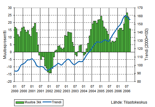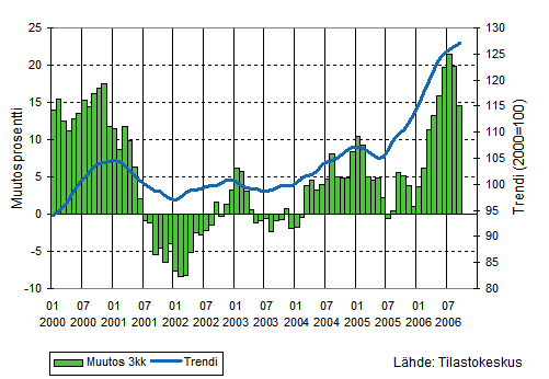 Teollisuuden liikevaihdon kolmen kuukauden liukuva vuosimuutos ja trendi 1/2000-9/2006, 2000=100