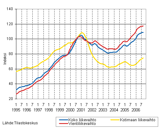 Sähkö- ja elektroniikkateollisuuden liikevaihdon, kotimaan liikevaihdon ja vientiliikevaihdon trendisarjat 1/1995 - 9/2006, 2000=100