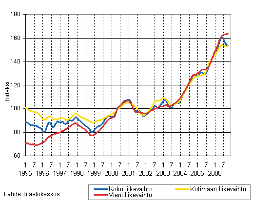 Kemianteollisuuden liikevaihdon, kotimaan liikevaihdon ja vientiliikevaihdon trendisarjat 1/1995 - 10/2006, 2000=100