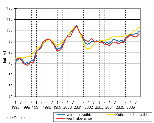 Puu- ja paperiteollisuuden liikevaihdon, kotimaan liikevaihdon ja vientiliikevaihdon trendisarjat 1/1995 - 11/2006, 2000=100