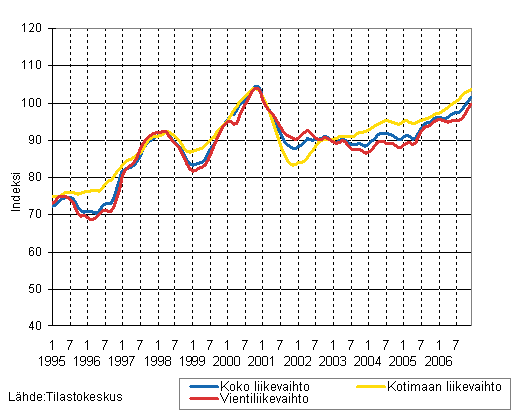 Puu- ja paperiteollisuuden liikevaihdon, kotimaan liikevaihdon ja vientiliikevaihdon trendisarjat 1/1995 - 12/2006, 2000=100