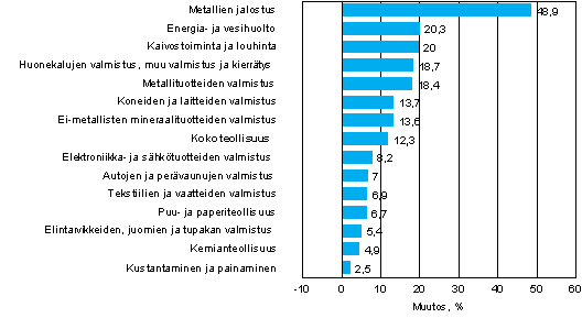 Liikevaihto kasvoi loka-joulukuussa eniten metallien jalostuksessa, 48,9 prosenttia ja energia- ja vesihuollossa, 20,3 prosenttia. Näiden toimialojen liikevaihdon kasvuun vaikutti perusmetallien ja sähkön kallistuminen. Myös kaivostoiminnassa ja louhinnassa liikevaihdon kasvua tuki tuottajahintojen nousu. Liikevaihto kasvoi loka-joulukuussa kaikilla teollisuuden alatoimialoilla. Hitainta liikevaihdon kasvu oli kustantamisen ja painamisen toimialalla.