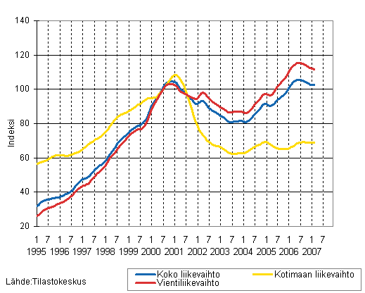 Sähkö- ja elektroniikkateollisuuden liikevaihdon, kotimaan liikevaihdon ja vientiliikevaihdon trendisarjat 1/1995 - 02/2007, 2000=100