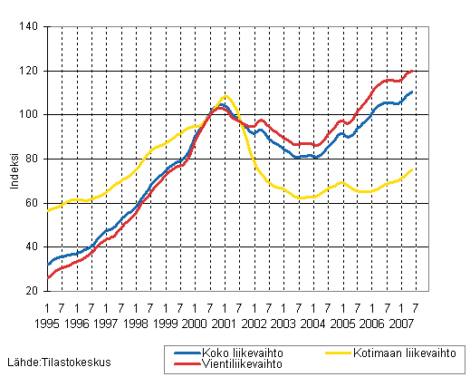 Sähkö- ja elektroniikkateollisuuden liikevaihdon, kotimaan liikevaihdon ja vientiliikevaihdon trendisarjat 1/1995 - 05/2007, 2000=100