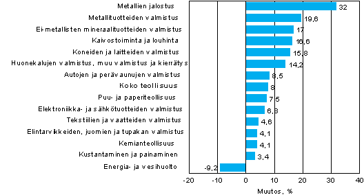 Liikevaihto kasvoi maalis-toukokuussa eniten metallien jalostuksessa, 32,0 prosenttia ja metallituotteiden valmistuksessa, 19,6 prosenttia. Näiden toimialojen liikevaihdon kasvuun vaikutti yhä perusmetallien kallistuminen. Myös puu- ja paperiteollisuudessa liikevaihdon 7,5 prosentin kasvua tuki tuottajahintojen nousu, erityisesti puutavaran osalta. Muista suurista toimialoista liikevaihto kasvoi sähkö- ja elektroniikkateollisuudessa 6,8 prosenttia ja kemianteollisuudessa 4,1 prosenttia vuodentakaisesta. Liikevaihto kasvoi maalis-toukokuussa kaikilla muilla teollisuuden alatoimialoilla paitsi energia- ja vesihuollossa.
