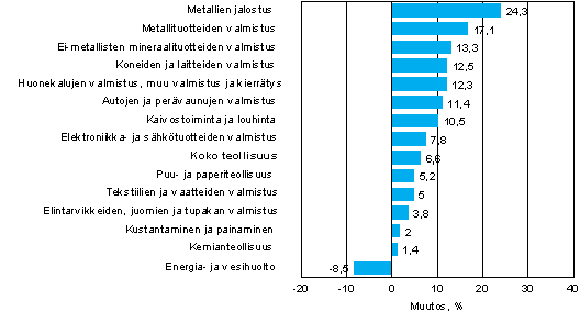 Liikevaihto kasvoi huhti-kesäkuussa eniten metallien jalostuksessa, 24,3 prosenttia ja metallituotteiden valmistuksessa, 17,1 prosenttia. Näiden toimialojen liikevaihdon kasvua ylläpiti yhä perusmetallien kallistuminen vuodentakaisesta. Myös puu- ja paperiteollisuudessa liikevaihdon 5,2 prosentin kasvua tuki tuottajahintojen nousu, erityisesti puutavaran osalta. Muista suurista toimialoista liikevaihto kasvoi sähkö- ja elektroniikkateollisuudessa 7,8 prosenttia ja kemianteollisuudessa 1,4 prosenttia vuodentakaisesta. Liikevaihto kasvoi huhti-kesäkuussa kaikilla muilla teollisuuden alatoimialoilla paitsi energia- ja vesihuollossa.